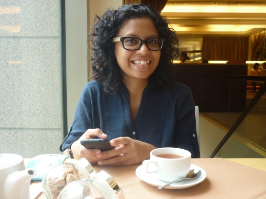 Chocolate cake again.Me enjoying the cup of tea in front. I was extremely stuffed here!