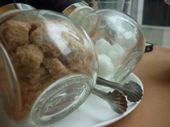 Mr Bear posing for shot. He was drinking some funky drink, which has a coffee ice cubes and then they pour milk all over it. Its kinda groovy tasting but it led to us eventually skipping dinner cos’ his stomach went wonky after that. Regretted drinking the drink after that.Stomachache has not started yet.Some arty shot of the sugar cubes. The bottles are nice.