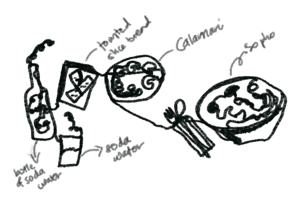 I’m sorry the drawing is to be desired… seriously. But yes, that’s a chicken slice and cheese croissant that I bought from Starbucks at a rest stop on the way to Kuala Lumpur. A milo packet to keep me full.